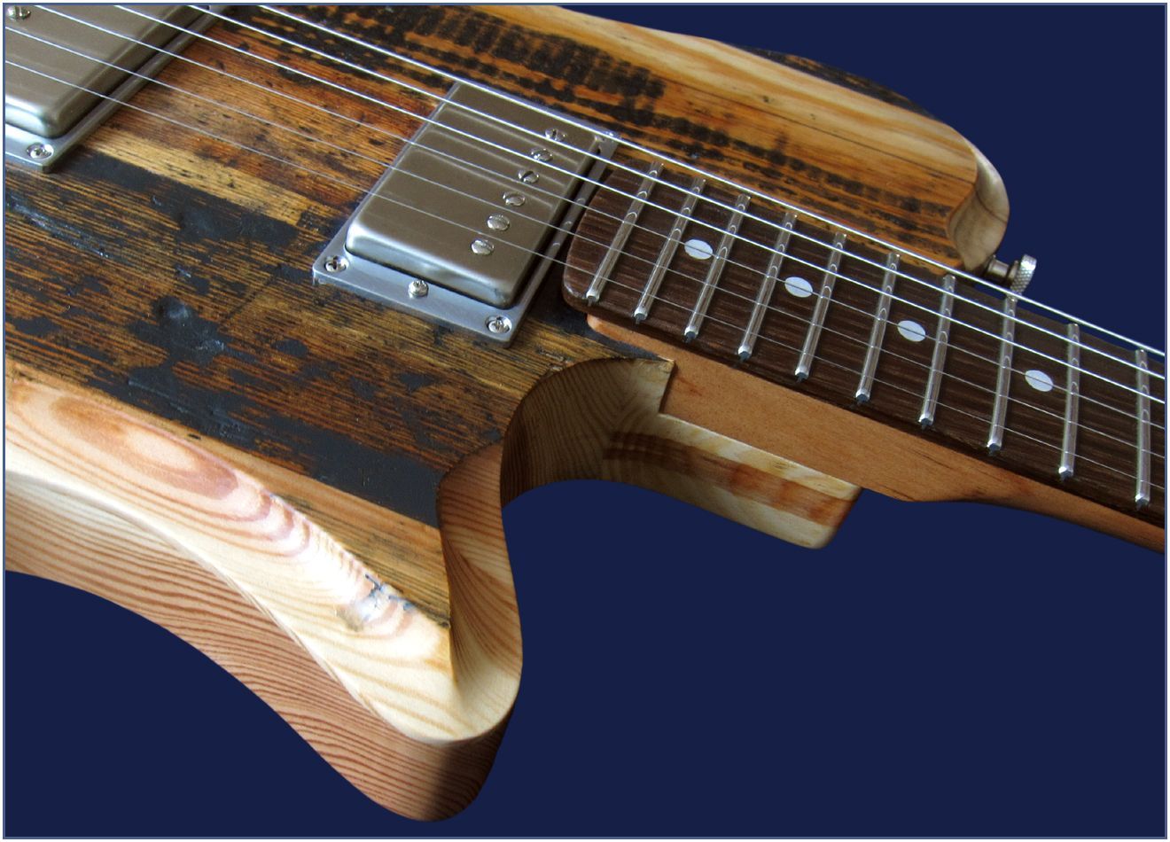 - HALS: Pitch Pine aus Bühnenboden des Volkstheaters Wien; Eichegriffbrett, Halsshaping 21 C, 22 Bünde, 12 '' Griffbrettradius; Clay Dots